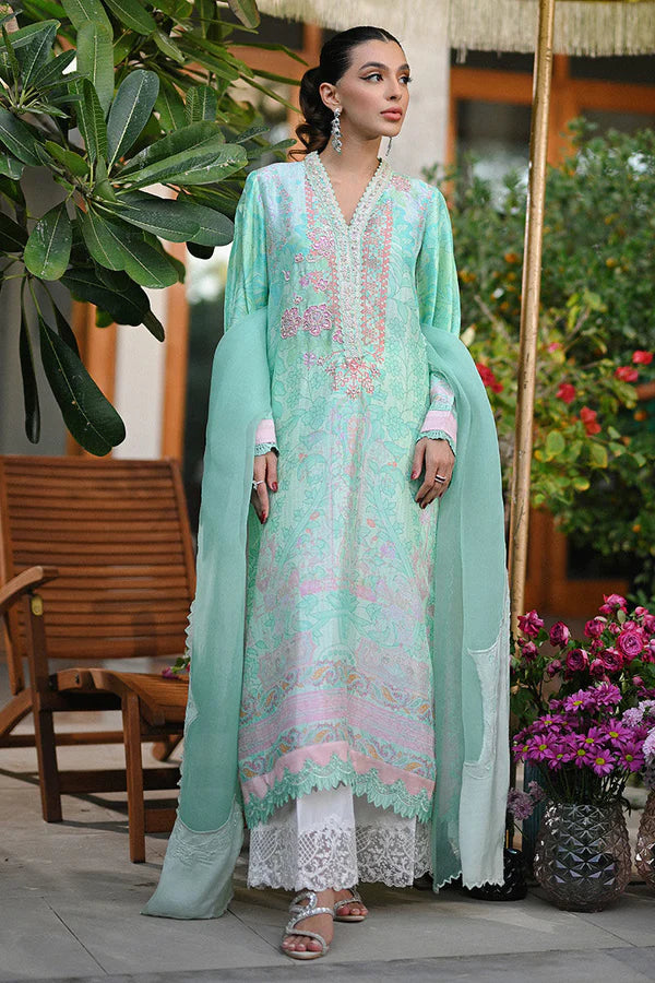 An elegant aqua green digitally printed long shirt with delicate hints of pink, adorned with intricate embroidery, cutdana, tikki stones, and sitara accents. Featuring a tilla patti neckline, it is paired with an ethereal organza dupatta and izaar pants embellished with lace borders.