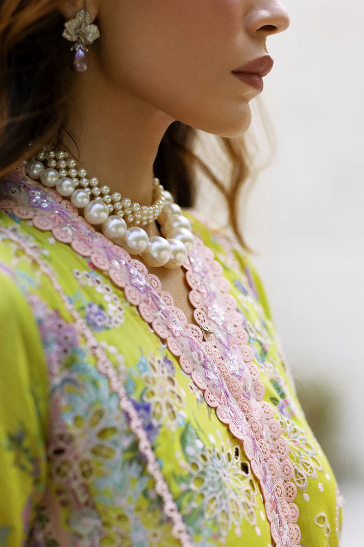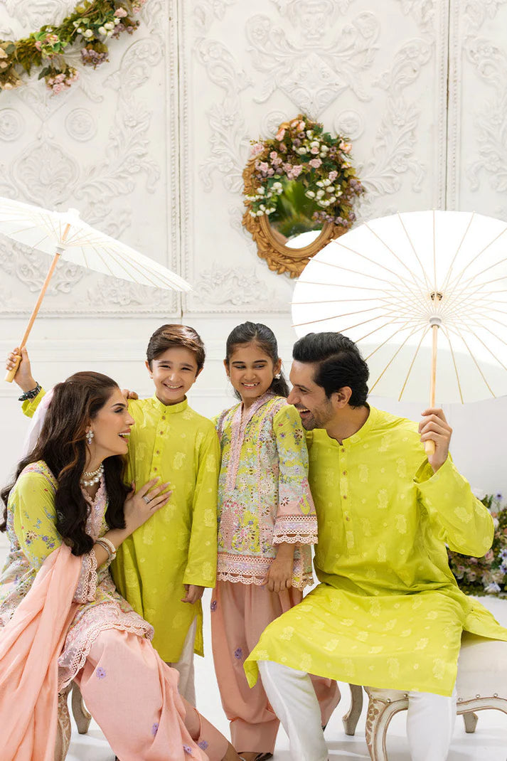 This lively short shirt in lime and pink brings a fresh burst of color to your wardrobe. The bell sleeves, detailed with tilapatti work, add flair, while the farshi shalwar—adorned with bootis—offers a nod to tradition. The dupatta, with its soft organza panel, adds a touch of airiness, making it ideal for any celebration that calls for a vibrant, festive look.