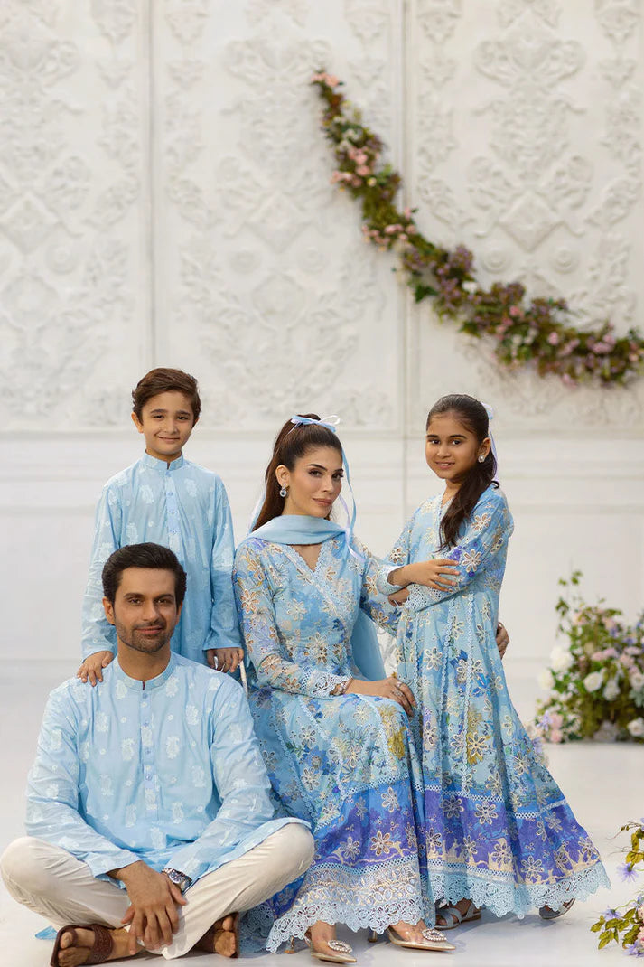 A classic blue angharka with long, fitted sleeves and intricate schiffli detailing exudes effortless elegance. The subtle tonal border enhances the silhouette, while the straight pants provide a refined finish. Paired with a soft dupatta, this piece perfectly marries tradition with modern flair, ideal for any occasion where understated luxury is called for.