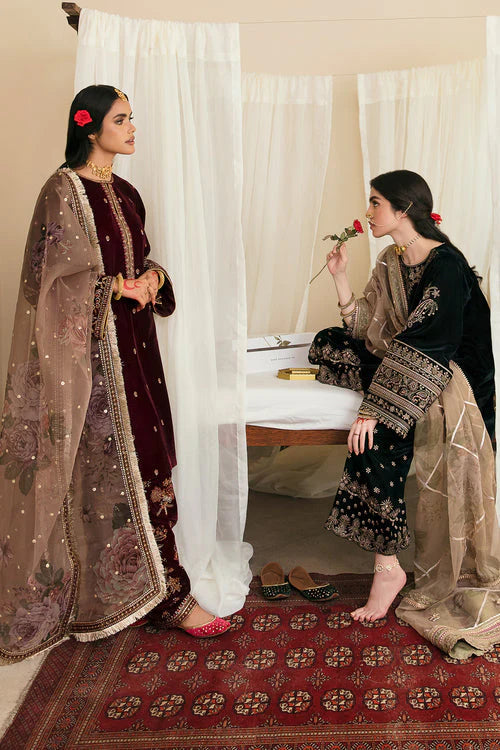 This rich velvet is featuring intricate embroidery throughout. The shirt showcases embroidered velvet on both the front and back, while the sleeves are also adorned with embroidery and finished with a velvet patch. The digital-printed organza dupatta is paired with a velvet-embroidered patch, adding elegance. The trousers, crafted from velvet, come with matching embroidered patches, and the outfit is completed with a velvet-embroidered neckline and back neckline for a regal finish.