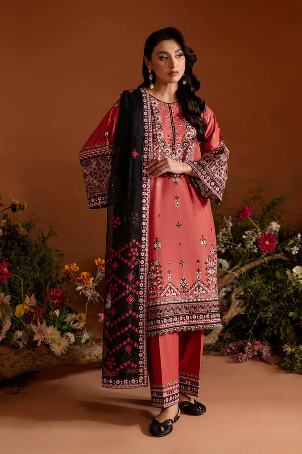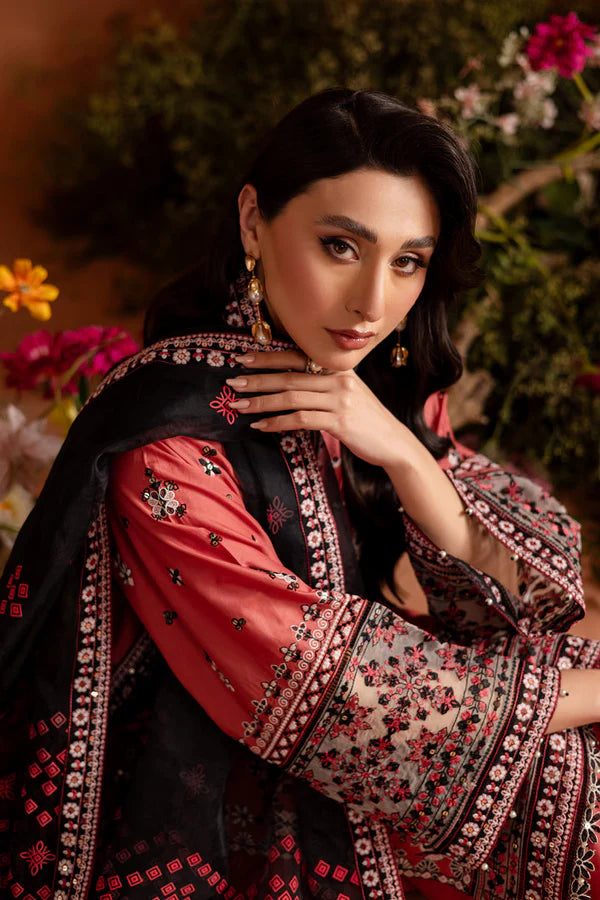 This striking rust pima lawn heavy embroidered straight Kurta shirt features intricate ethnic embroidery all over, creating a rich and detailed design. The square embroidered neckline adds a traditional yet stylish touch, while the sleeves are beautifully enhanced with contrast organza borders and a lace finish, giving the shirt a refined and elegant look.