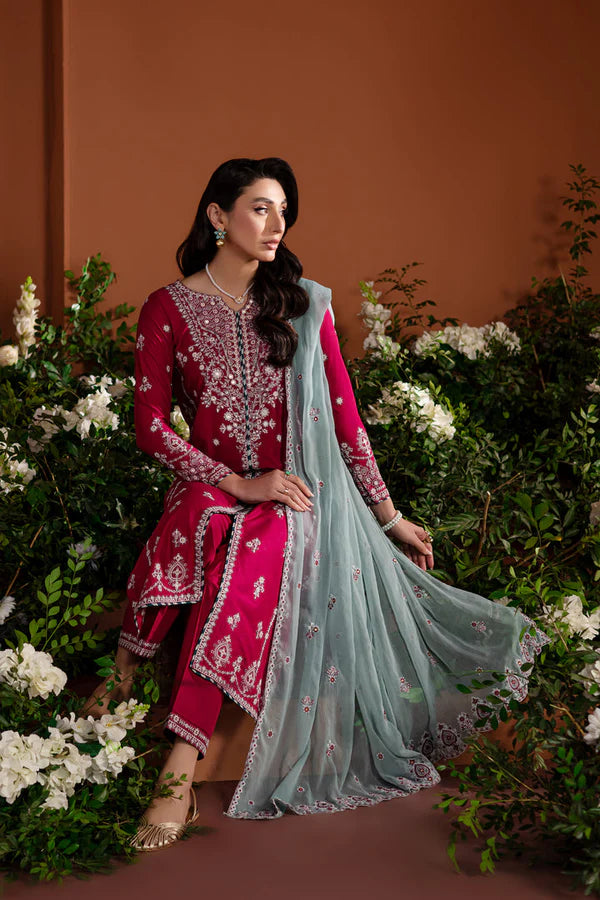 The ensemble is completed with a contrasting crinkle embroidered dupatta, offering texture and depth with its detailed embroidery, perfectly balancing the shirt and trousers while adding a graceful, contemporary element to the overall look.