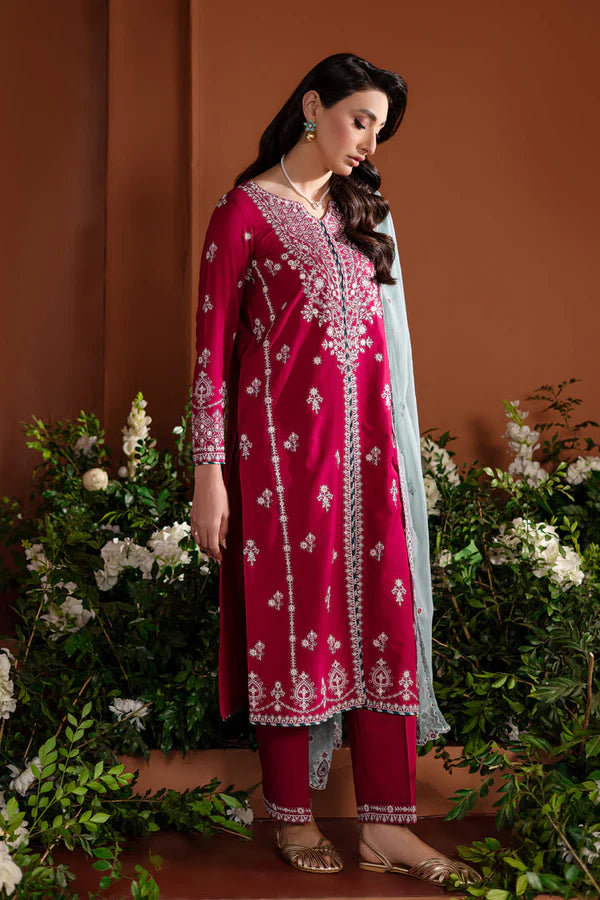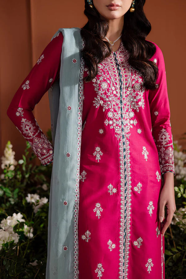 This stylish pink pima lawn front-open embroidered shirt features printed facings that add a unique touch to its design, while the fitted embroidered sleeves provide a sleek, elegant look. The intricate embroidery on the shirt creates a sophisticated and timeless appeal.