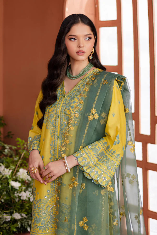 This elegant fully embroidered golden green pima lawn front-open shirt features intricate contrasting embroidery all over, creating a visually stunning design. The shirt is finished with exquisite kawiya finishing, adding a unique and refined touch to the overall look.