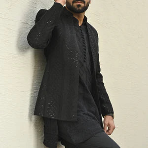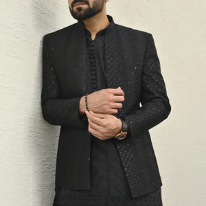 Black Embroidered Front Open Princecoat For Wedding - HK Fashion