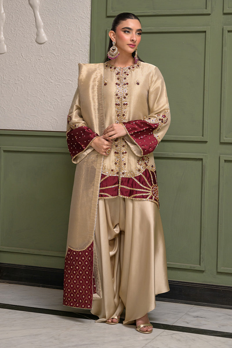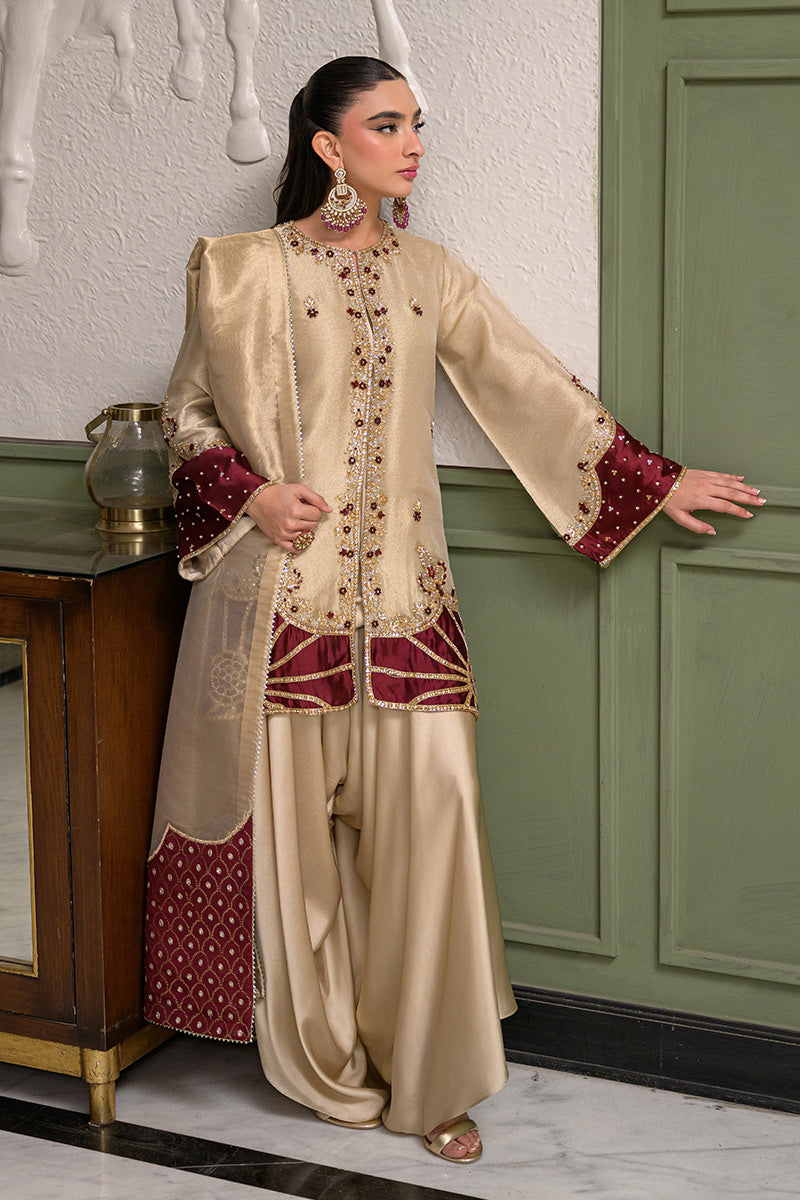 Shine in this opulent skin gold ensemble, featuring an intricately embellished jacket layered over an inner, paired with silk box pants and a zari tissue dupatta adorned with maroon rosy appliqués. Crafted in skin gold zari khadi fabric, the jacket is beautifully enhanced with maroon appliqué details and adorned with exquisite handwork of pearls, kora, dabka, crystals, stones, gems, and sequins. Delicate rose motifs grace the hem and back of the jacket, with further embellishment on the sleeves and neckline, creating a statement of timeless elegance.
