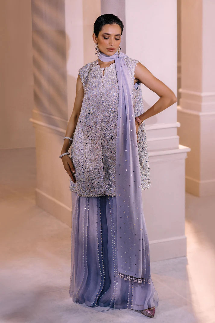 A bold and chic ensemble, 'Cristallin Lilas'; the short, front open shirt is adorned with sprawling artwork made out of 'Broderie Anglaise' cutwork technique and worn with an intricately embellished dupatta with scintillating sequin swirling to lend glamour to the look. Layered over a finely pleated, organza sharara adorned with scintillating sequin, this grand design makes an opulent statement.