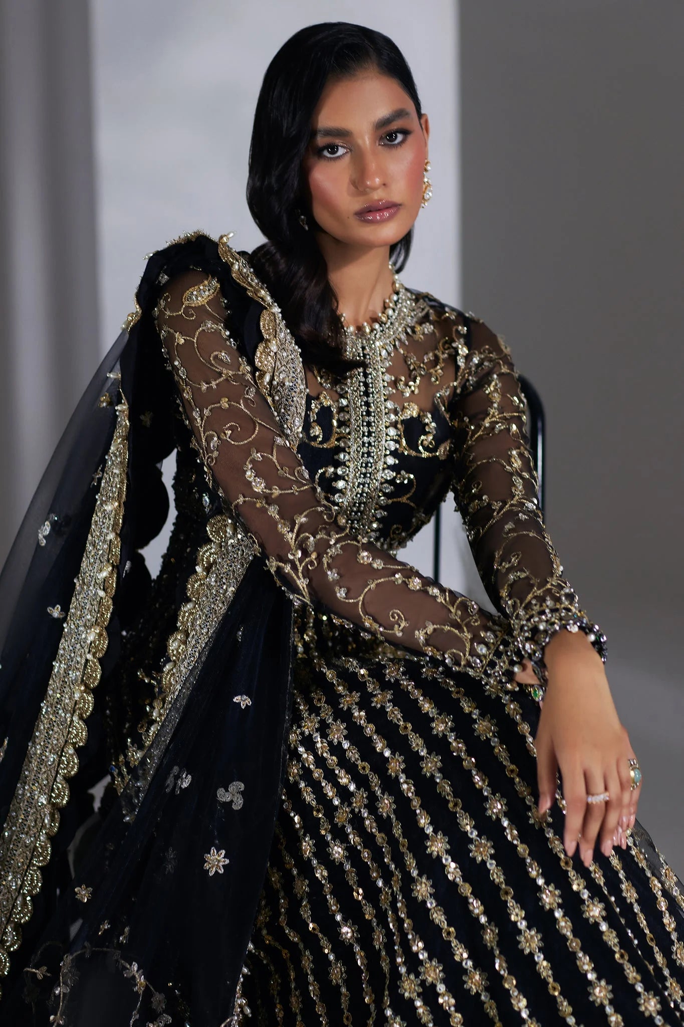 Introducing ‘Lueur Dorée,’ an extraordinary ensemble destined to command the spotlight with its opulent elegance. This luxurious masterpiece, crafted from a sumptuous obsidian canvas, is adorned with an exquisite array of sequins, crystals, GOTA, and ebony pearls, all accentuated with scintillating gold to create a striking and unforgettable statement. The intricate embellishments form patterns that resemble verses of gilded poetry, meticulously woven into the fabric. Paired with a diaphanous organza dupatta, framed by an exquisitely embellished border, this ensemble epitomizes the pinnacle of refined design and style. Ensuring the wedding festivity is transformed into a vision of sophistication and charm, ‘Lueur Dorée’ stands as the quintessential highlight of any celebration, embodying timeless luxury and unparalleled beauty.