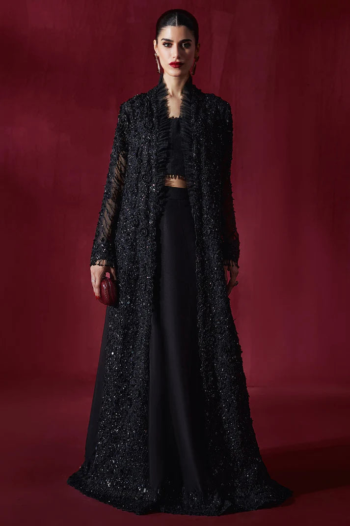Adorned with obsidian beads in an exquisite cutwork technique, the 'Nuit Étoilée' ensemble exudes opulence and sophistication. Its flowing, front-open jacket captures attention with its intricate craftsmanship and shimmering sequins that add a touch of allure. Paired with the quintessential Elan tassel blouse, this ensemble radiates refined glamour. Finely crafted organza pants, delicately bordered with scintillating sequins, complete the look, showcasing an exceptional blend of luxury and artistry.Step into the enchanting allure of the festive season with the distinguished elegance of ‘Cristal Foncé’. This opulent ebony ensemble showcases a long jacket adorned in a mesmerizing lattice of obsidian crystals, each meticulously positioned to radiate unparalleled brilliance. Paired flawlessly with impeccably tailored pants, this bespoke creation exudes fluid grace, making a resolutely sophisticated statement at every turn.