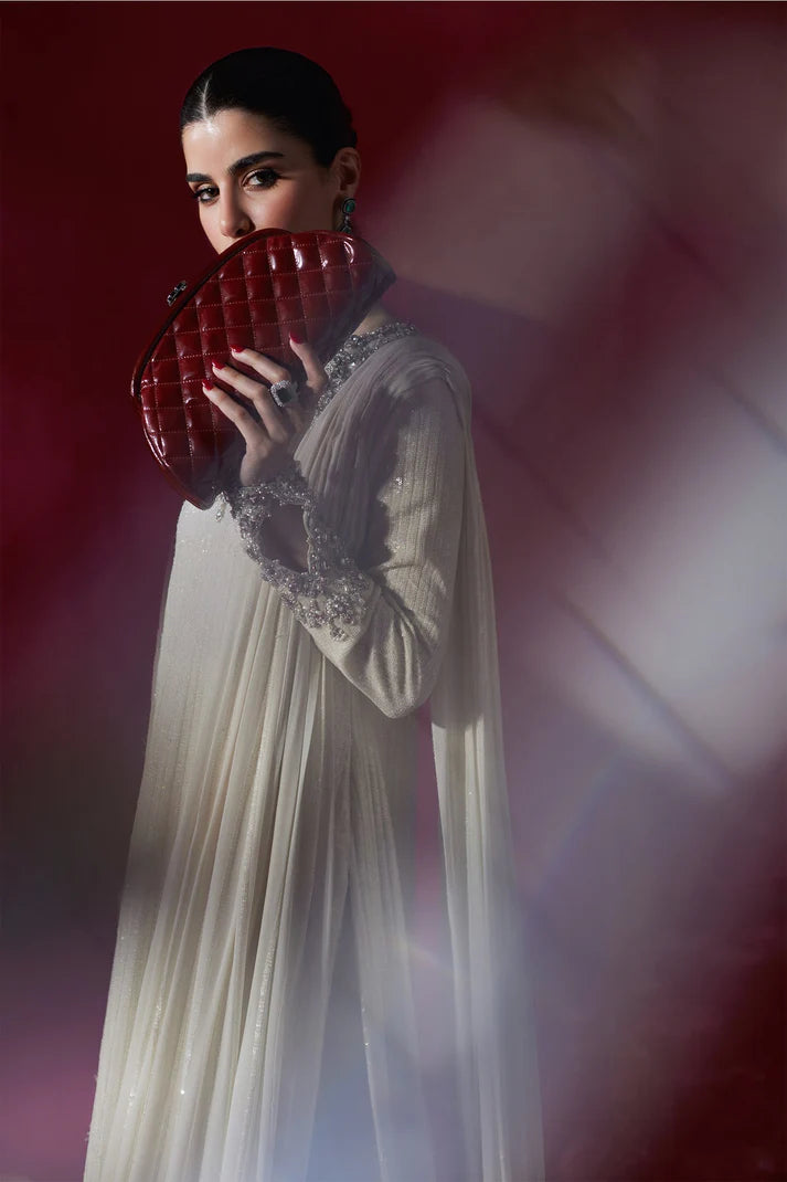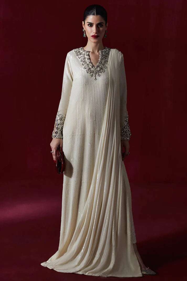Exquisitely crafted from the finest fabric in a soft, ethereal hue, this masterpiece glimmers with intricate hand embellishments, captivating all who behold it. The luxuriously frosted chiffon in 'Poussière de Lune' drapes the body with enthralling delicacy, as a cascade of scintillating sequins creates a mesmerizing display of opulence. The meticulously draped dupatta, lavishly adorned with sequins, is elegantly fastened to the shirt, achieving an effortlessly regal formal look.