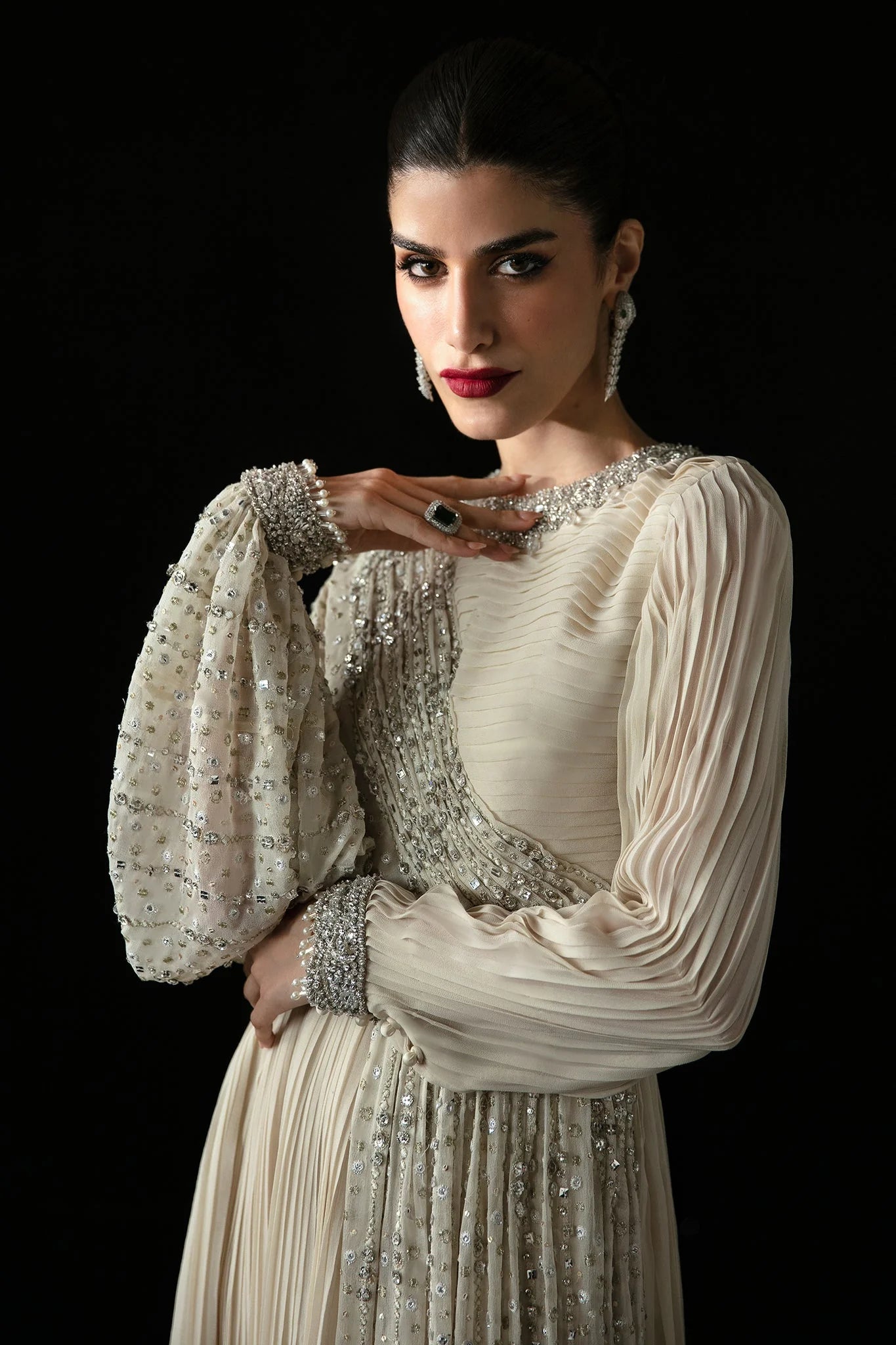 Introducing 'Cristal de Lune'—a spellbinding ivory ensemble that exudes the essence of moonlit elegance. This ethereal creation captures the allure of stardust, with delicate crystal embellishments shimmering across pure chiffon like scattered moonlight. Designed with a graceful, flowing silhouette, it is impeccably structured for a flawless fit, enhanced by a crystal-embellished neckline and an ornate belt that adds a touch of opulent charm. Each hand-crafted detail elevates its allure, with exquisitely embellished sleeves that finish in delicate pearl tassels, adding a final note of refined luxury. Cristal de Lune is a true masterpiece of sophistication—a vision of elegance that captivates, enchants, and leaves a lasting impression.