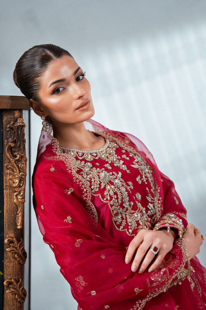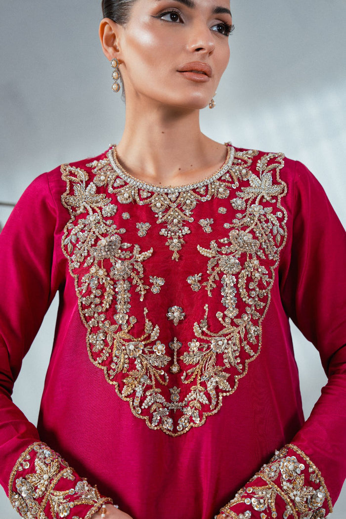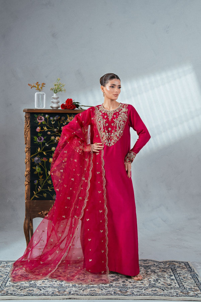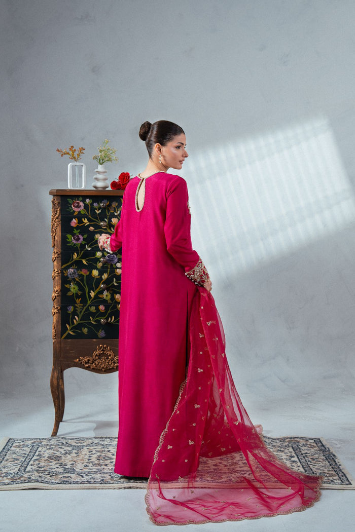 A stunning shocking pink shirt featuring a delicately hand-embellished neckline and sleeve borders, adorned with multiple shades of gold using exquisite materials like kora, naqshi, cut stones, and Swarovski crystals. Paired with a plain straight trouser for a graceful balance, and completed with a dupattā finished with scalloped edging and a subtle boti spray, this ensemble blends elegance with refined luxury.