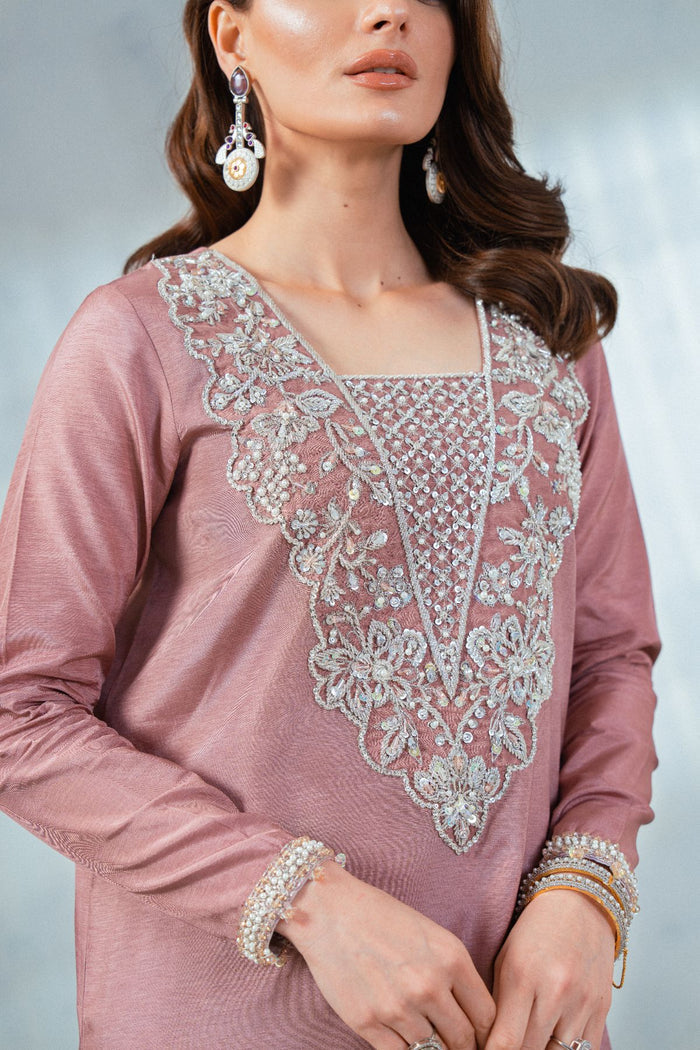 A graceful ensemble featuring a shirt with a double-layered neckline, beautifully purely embellished in silver shades material like kora naqshi cut stone etc for a refined, luxurious appeal. Paired with a flared pant finished with a 1-inch border for a polished look. Completed with a dupatta adorned with scalloped edging and heavy boti spray, adding the perfect touch of elegance.