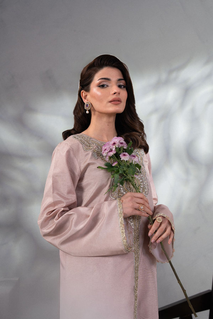 A delicate tea pink semi front-open shirt, beautifully highlighted with a heavily embellished neckline and front-open pati. Purely handcrafted details feature gold naqshi, silver dabka, silver and gold cutstones, and shimmering silver Swarovski stones. Paired with a flared pant edge border the look is completed with an elegant dupatta adorned with four-sided borders and a subtle spray, creating a refined and graceful ensemble.