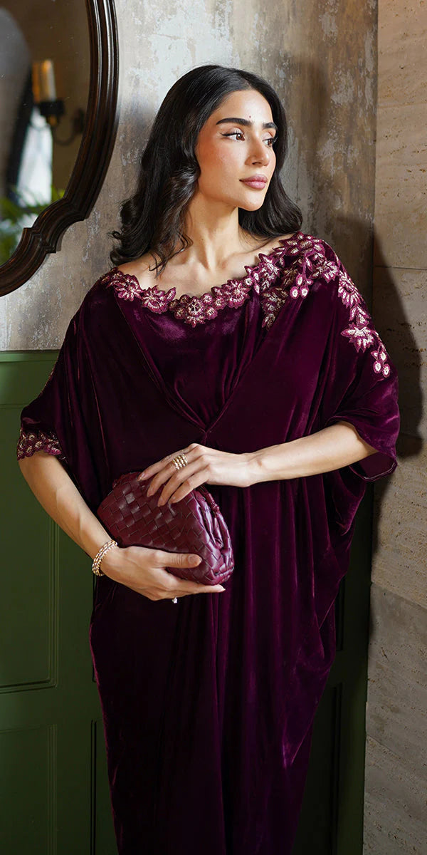 Elevate your winter wardrobe with this deep wine kaftan, a true embodiment of luxury. Featuring a chic neckline, adorned with exquisite cutwork embroidery in gleaming gold metallic thread and resham, it’s a flawless fusion of opulence and artistry—designed to make you a style icon.