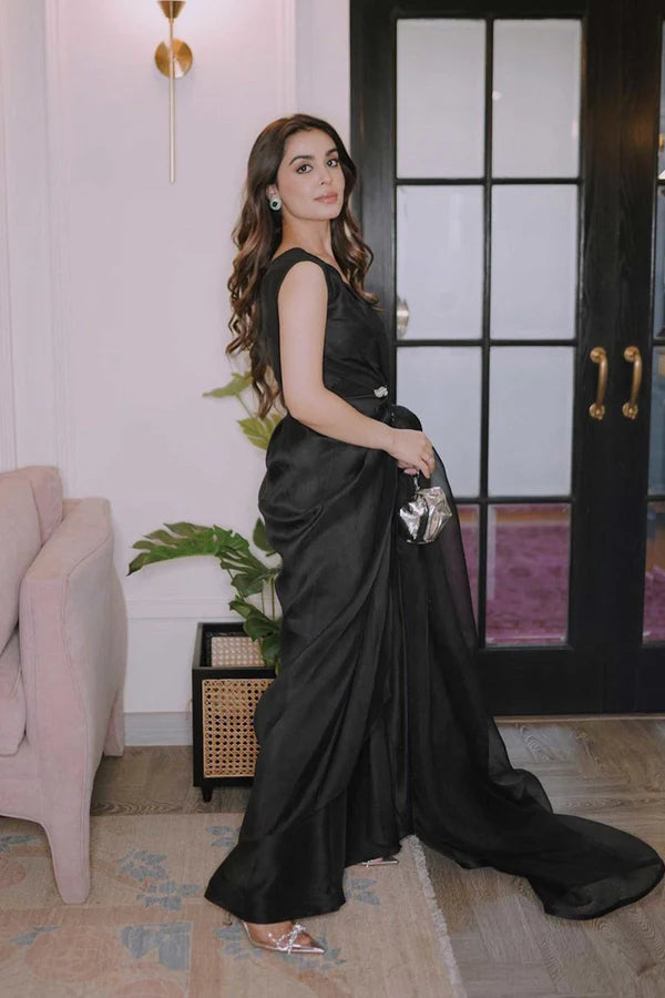 Asymmetrical draped dress with chunky crystal and zardozi embroidery motifs. It is paired with a plain organza dupatta with a silk finish and silk boot-cut pants.