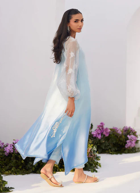 Farah Talib Aziz | Zaza Luxe Pret 24 | BOW OMBRE BLUE EMBELLISHED KAFTAN CUT SHIRT