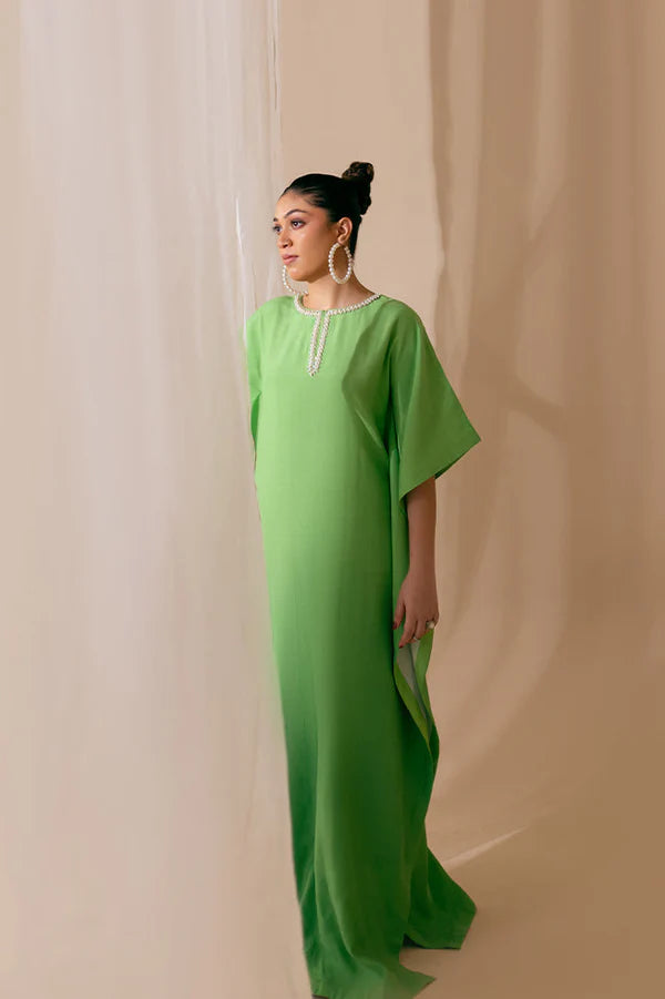 This green ombre kaftan offers a serene blend of shades, creating a soft, natural flow. The neckline features elegant embellishments, adding just the right amount of detail to elevate the look. With its fluid drape and refined accents, this kaftan brings an easy elegance to any occasion.