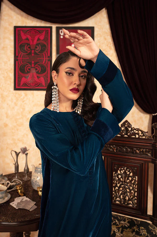 Completing the look is an exquisite navy shawl, richly embroidered with nature-inspired patterns. The luxurious cord-look embroidery along the borders and tassel-adorned corners offer an extra layer of refinement, making this ensemble a statement in every way.