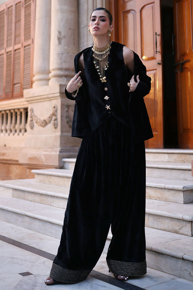 A sophisticated ensemble featuring a pure velvet waistcoat and blazer in classic Black. The blazer’s back is adorned with intricate gold and silver embroidery, while the waistcoat is detailed with imported buttons on the front for a refined finish. Paired with farshi culottes in pure velvet, embellished with silver and gold embroidery along the hem, this look blends regal craftsmanship with contemporary tailoring.