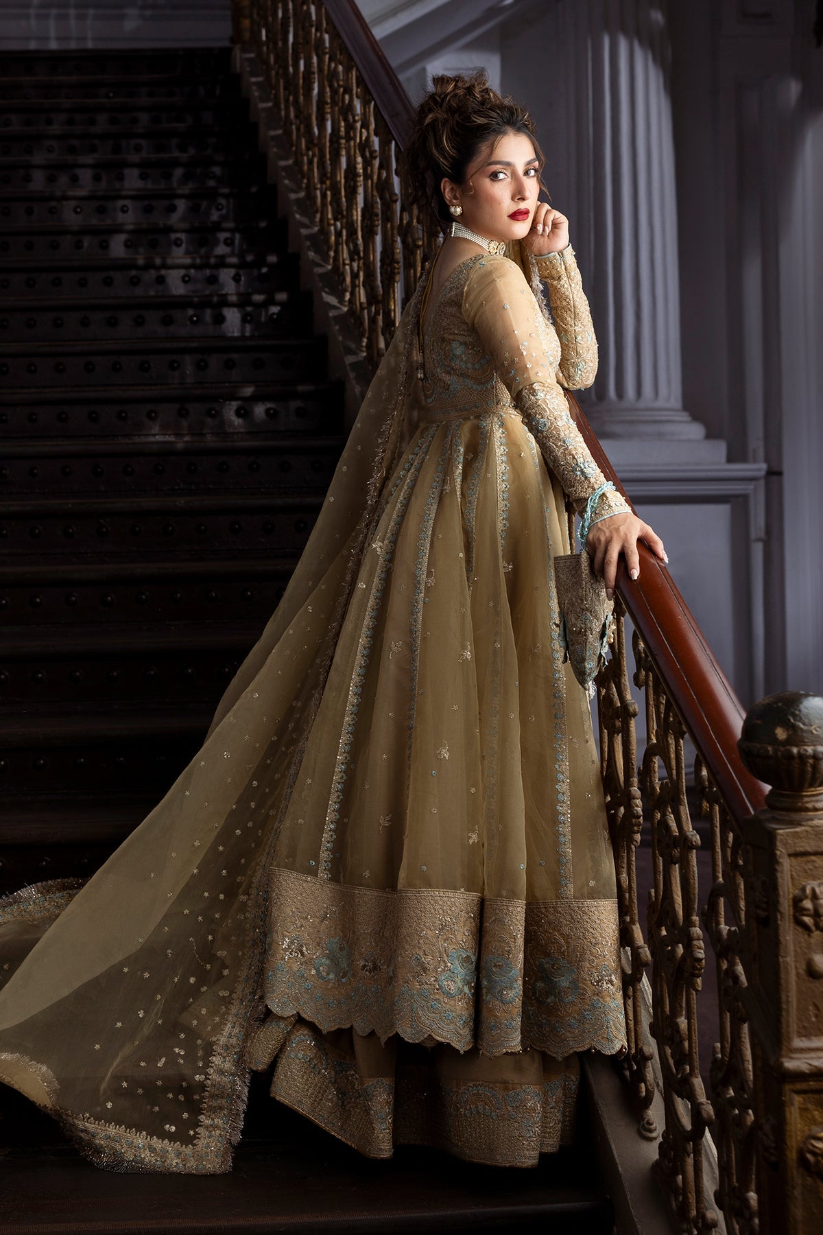 A embroidered festive pishwas, with its intricate gold embroidery and subtle farozi accents. The lightweight Organza drapes elegantly on the body, creating a flowing silhouette that is both elegant and sophisticated.