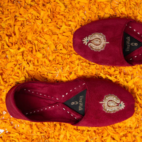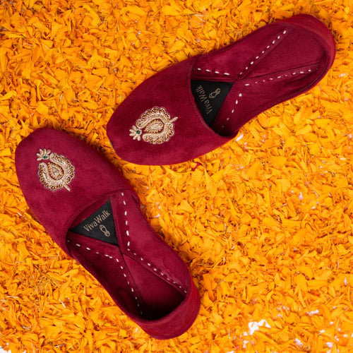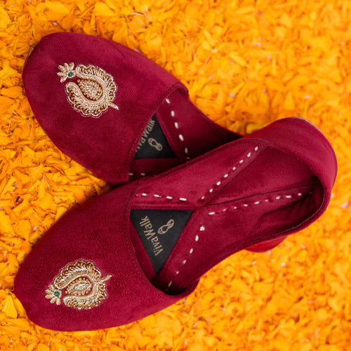 Gul e Ahmar is a celebration of vibrant tradition and refined style. These maroon khussas are crafted to perfection, adorned with intricate hand-embroidered kora and mooti work, adding a touch of desi elegance. Perfect for any festive occasion, they bring unmatched grace and cultural charm to your wardrobe.