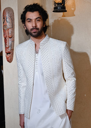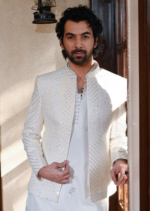 Make a grand statement with this Off White Front Open Prince Coat, crafted from raw silk embroidered sequin work fabric for a sophisticated and royal look. The front-open design adds a modern touch, while the intricate embroidered patters enhance its luxurious appeal. Perfect for weddings, receptions, and formal celebrations, this coat pairs effortlessly with a kurta-pajama or sherwani, ensuring a timeless and refined appearance.