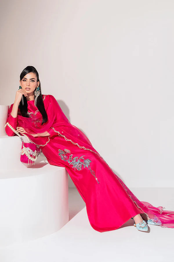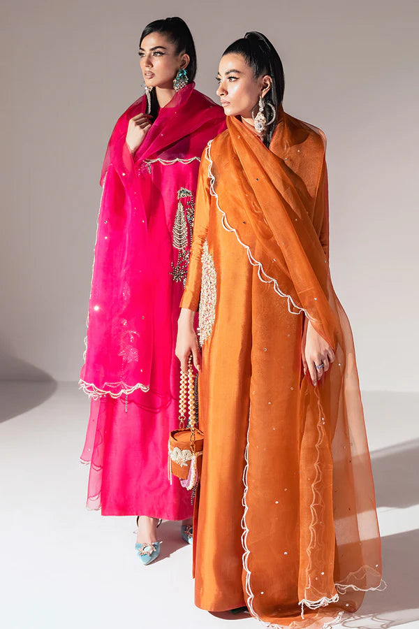The bold and vibrant hawt pink long Kaftaan dress in tissue silk fabric is a true statement piece. Crafted with intricate silver embellishment on black thread, this ensemble is designed to make you look feminine and glamorous. The hawt pink matching organza scalloped dupatta perfectly complements the outfit.