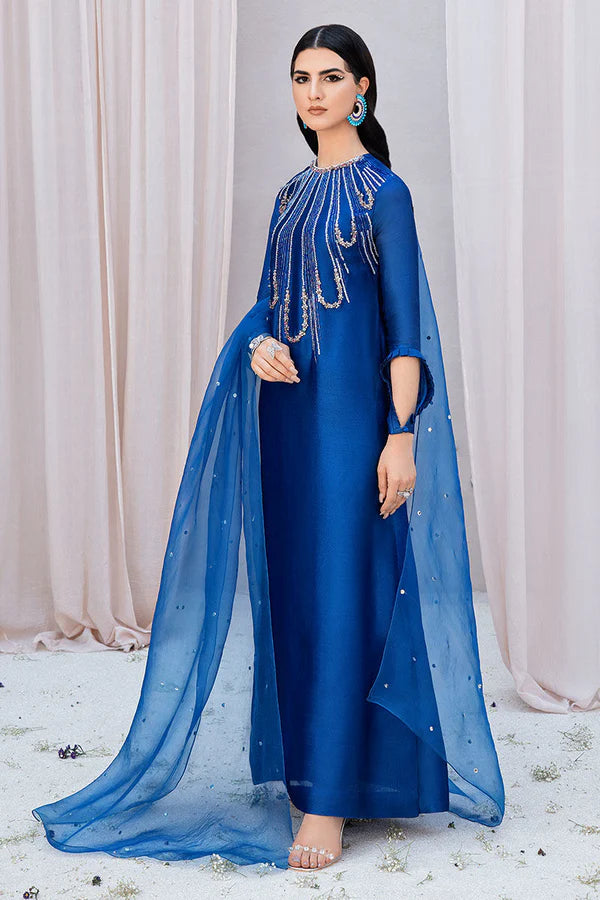 Long Tissue Silk kaftan shirt in royal cobalt blue with finely hand embellished neckline design. Sleeves are fitted with key hole detail and pleated frill stitched. It has short side slits and looks ethereal.