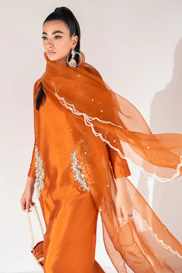 Crafted from the finest quality fabric, this rust orange long and chic Kaftaan shirt with short side slits is a true masterpiece. The silver embellishments add a touch of luxury to the outfit; it has two heavily embellished motifs on the sides with the modern detailed neckline. Perfected with the organza dupatta with a white border adds a touch of sophistication.