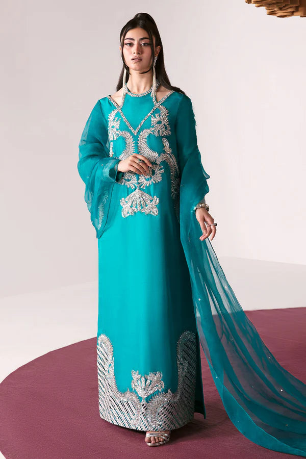 Make a dazzling statement with the RAZZLE DAZZLE long kaftan shirt, a captivating ensemble that is purely hand-embellished to perfection. This shirt is Deigned from premium quality Pure Rawsilk fabric in a stunning Ferozi color, The intricate hand-embellished details of the kaftan shirt exude luxury and sophistication, making it the perfect choice for any formal or special event. The shirt features a beautifully designed neckline, adding a touch of elegance and charm to your overall look. The shirt includes organza strips sleeves in ombre, creating a stunning visual effect that is both eye-catching and unique.