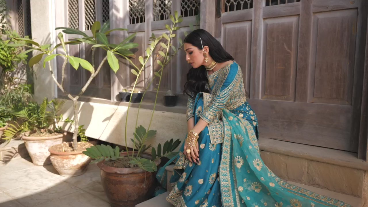 A beautiful teal attire curated with heavy embroidery and sequin work followed by a beautiful organza dupatta making it an outfit that€™ll make you stand out.