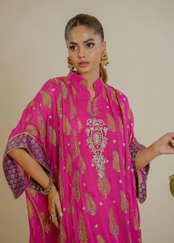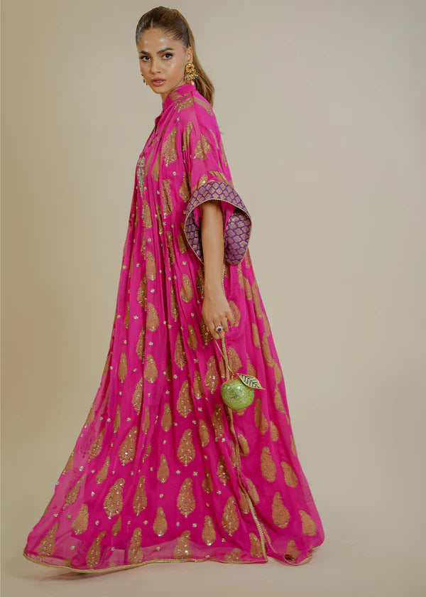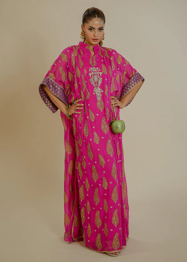 Mahgul's kaftan "Heer" is screen printed and features intricate hand embellishments that adds a touch of sparkle, while the soft chiffon ensures a graceful silhouette. Perfect for summer formals, this kaftan blends traditional craftsmanship with contemporary style, making it a standout piece in any wardrobe.