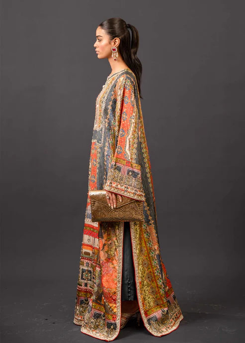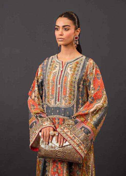 A Mughal inspired classic silk printed Kaftan resplendent with Mughal worthy hand embellishment throughout. Zardozi, gota, delicate kundan and bethki are used to elevate this bold print!
