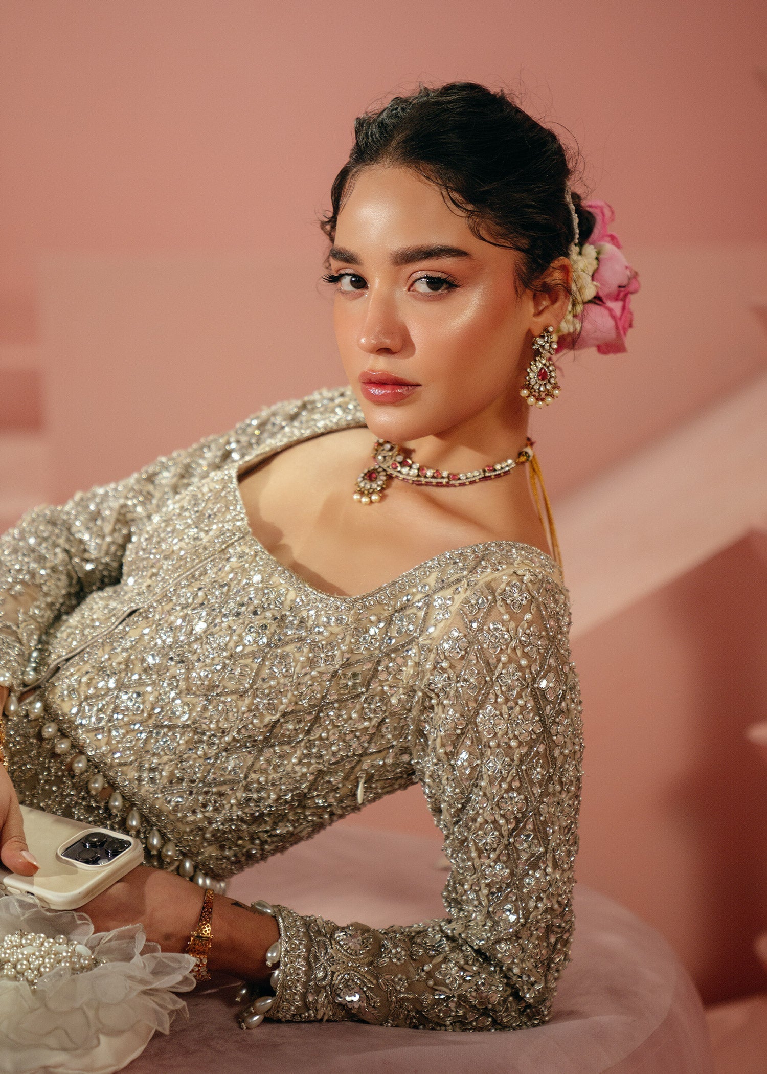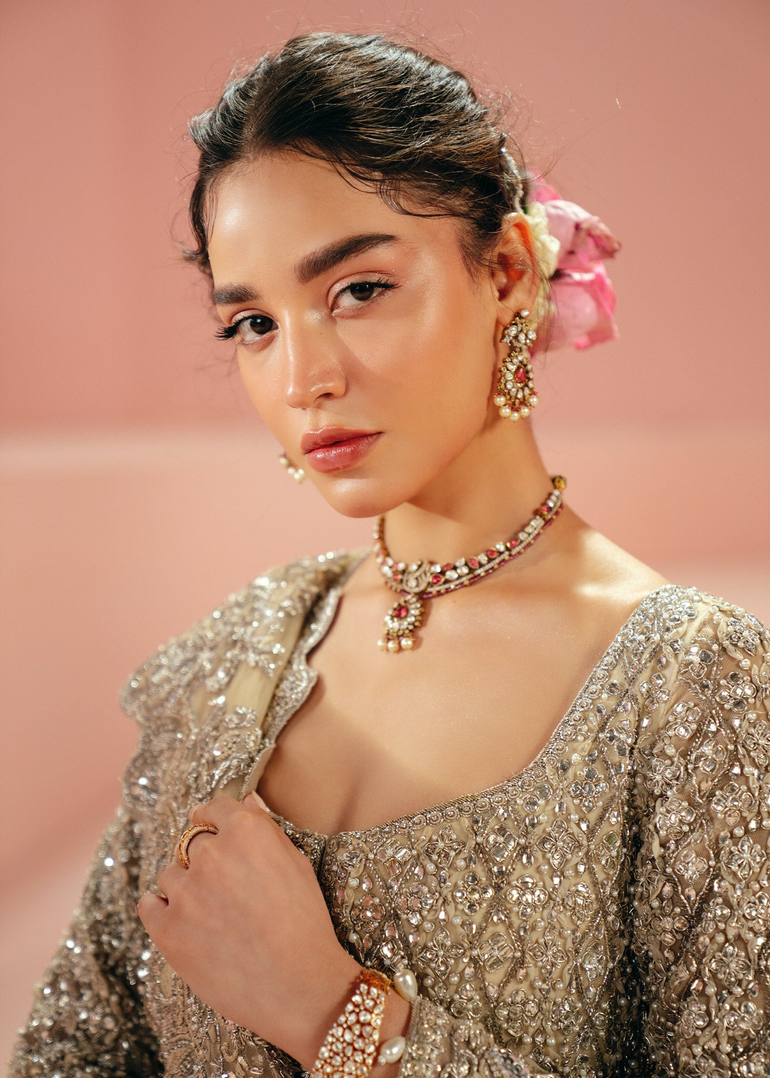 Koh I Noor is Mahguls crown jewel of the collection. Hand crafted fabric petals, pearls, mukesh, zardozi, marori taanka thread work, bethki and diamantes have been used to create intricate layers of work throughout this piece which unfold as you look closer and closer. The dupatta is an heirloom piece featuring aari, marori tanka, mukesh and zardozi. For those with a penchant for a bit of extra drama, pair this bridal with the heavily hand embellished veil.