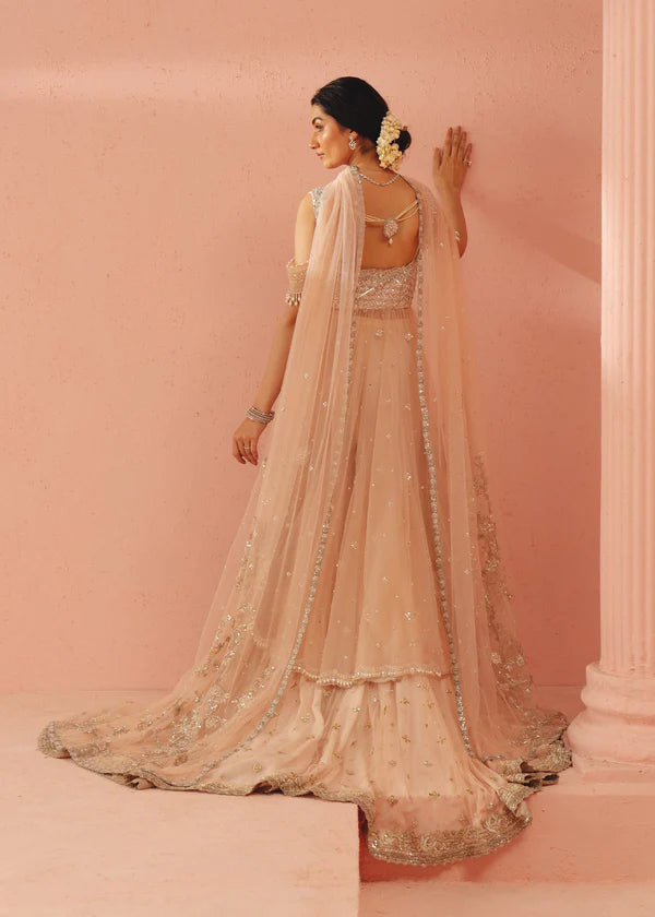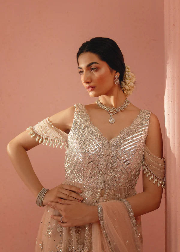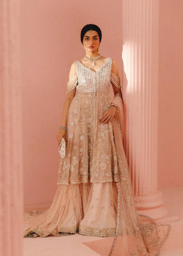 An ethereal ensemble featuring a delicately hand-embellished shirt, sharara, and dupatta on soft net fabric. Adorned with the timeless artistry of Zardozi, Mukesh, Kundan, pearls, Sitara, and diamantés, this outfit exudes elegance and grandeur, perfect for the modern bride who cherishes tradition.