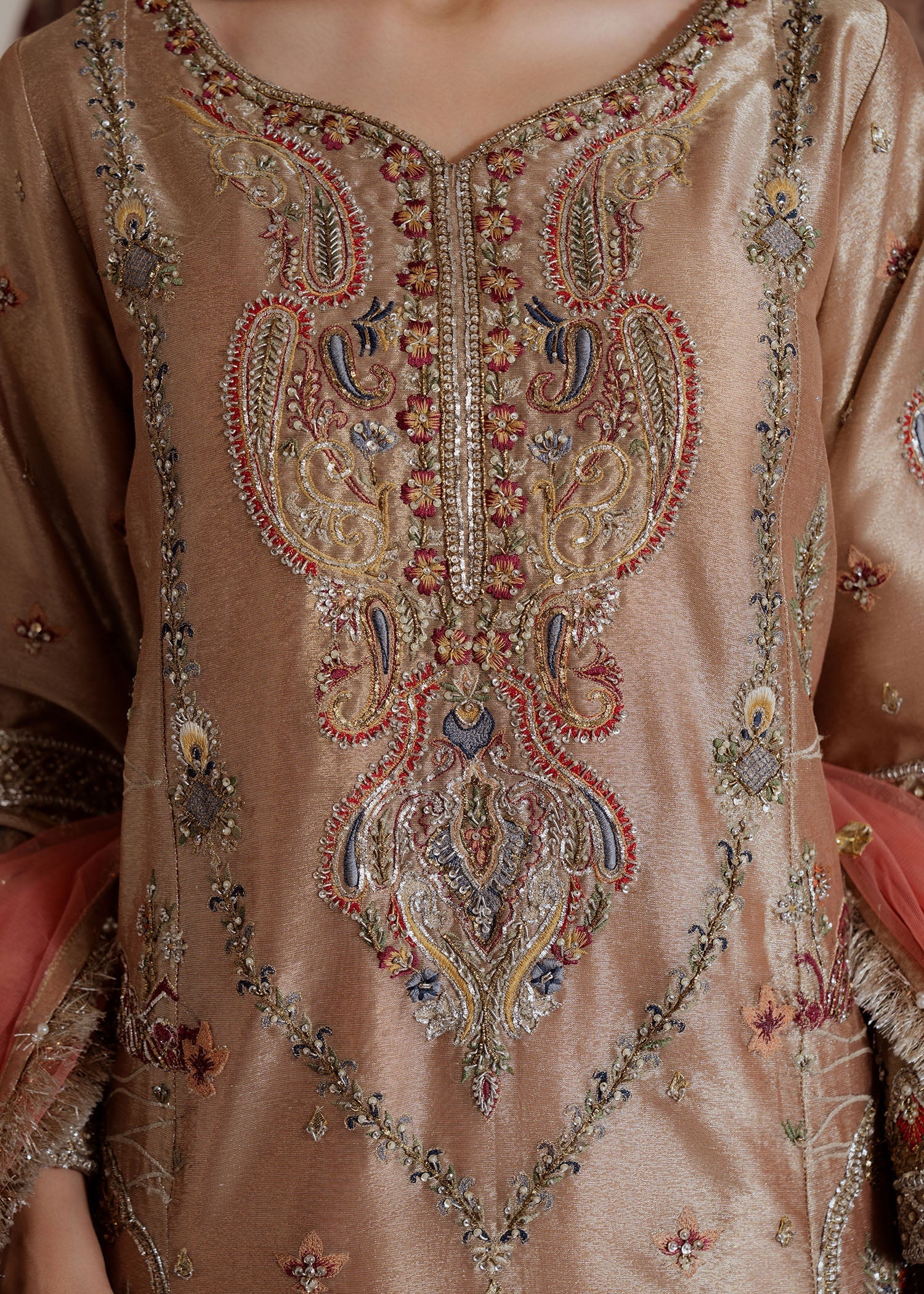 Illuminate your wardrobe with this exquisite long shirt crafted from luxurious tissue in a beautiful coral gold color. The ensemble is perfectly complemented by elegant jamawar trousers, adding depth and richness to the look. A delicate net dupatta enhances the outfit, offering an ethereal touch that makes this piece perfect for special occasions.