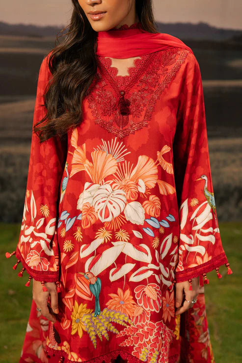 Color: Red Shirt Digital Printed Shirt 3.07m Dyed Embroidered Organza Neck Patch 1pc Dyed Embroidered Organza Border 1m Fabric: Arabic Lawn Trouser Dyed Trouser: 2.5m Fabric: Arabic Lawn Dupatta Digital Printed Dupatta 2.5m Fabric: Chiffon Note: Dry Clean Only