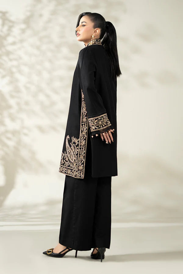 Shirt Embroidered Front-Open Shirt Embroidered Ban Neckline Embroidered Side Seams Embroidered Border Dyed Sleeves With Embroidered Border Lace & Pearl Drop Detailing On Sleeves Dyed Back Fit: Regular Color: Black Fabric: Khaddar Undershirt Dyed Sleeveless Undershirt Fit: Regular Color: Black Fabric: Khaddar Trousers Dyed Culottes Elasticated Waistband Fit: Regular Color: Black Fabric: Khaddar Work Details: Sequins, Tilla & Thread Embroidery Model is wearing xs size