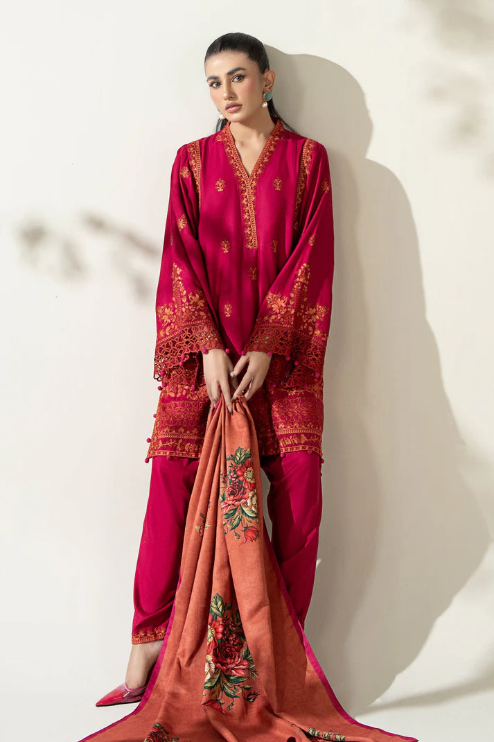 Shirt Embroidered Kashmiri Neckline Dyed Front With Spray Embroidery Embroidered Organza Border Embroidered Border On Shoulder Embroidered Sleeves With Kavya Border Crochet Balls Drop Detailing On Sleeves & Border Dyed Back Fit: Regular Color: Hot Pink Fabric: Marina Shalwar Dyed Shalwar Elasticated Waistband Embroidered Hem Fit: Regular Color: Hot Pink Fabric: Marina Dupatta Digital Printed Dupatta Color: Orange Fabric: Herringbone Model is wearing xs size