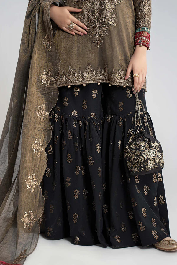 Shirt Dyed Straight-Cut Shirt Embroidered Round Neckline With Buttons Detailing Embroidered Border Full Sleeves With Motif & Velvet Embroidered Border Gotta Balls Drop Detailing On Sleeves & Border Dyed Back Fit: Regular Color: Black Fabric: Masoori Undershirt Dyed Sleeveless Undershirt (Attached) Fit: Regular Color: Black Fabric: Linen Gharara Dyed Jacquard Botti Gharara Elasticated Waistband Fit: Regular Color: Black Fabric: Jacquard Dupatta Dyed Dupatta Two-Side Velvet Embroidered Scalloped Border Two-Side Embroidered Border Color: Black Fabric: Maoori Work Details: Sequins, Tilla & Thread Embroidery Model is wearing xs size