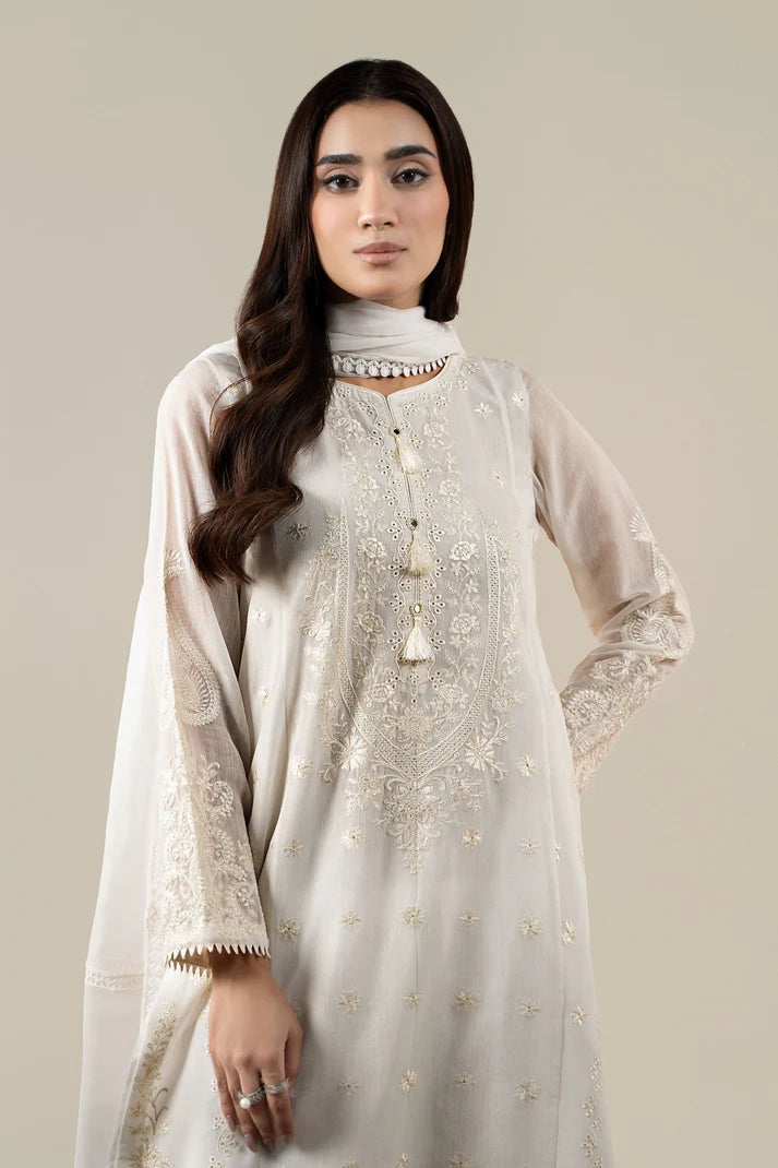 Shirt Embroidered Round Neckline With Tassels Detailing Dyed Front With Spray Embroidery Embroidered Side Seams Embroidered Organza Border Embroidered Full-Length Sleeves With Lace Detailing Dyed Back Fit: Regular Color: Off White Fabric: Paper Cotton Undershirt Dyed Sleeveless Undershirt Fit: Regular Color: Off White Fabric: Lawn Shalwar Dyed Shalwar Elasticated Waistband Fit: Regular Color: Off White Fabric: Cambric Dupatta Dyed Dupatta Embroidered Border Color: Off White Fabric: Blackwood Chiffon Work Details: Sequins & Thread Embroidery Model is wearing xs size