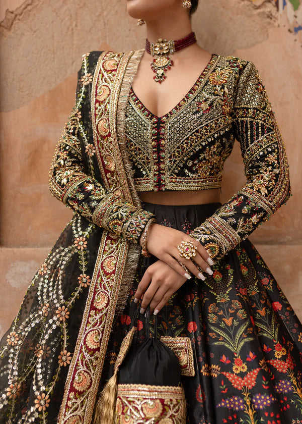 Embroidered & hand-embellished Choli with intricate neckline details, paired with a High Waisted printed lehnga featuring tilla & sequins-embroidered border. Complemented by an organza dupatta with sequins embroidery.