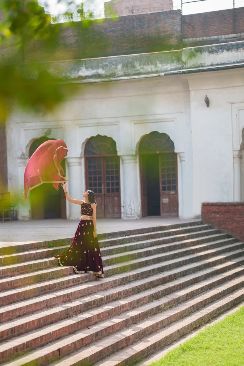It is paired with a matching velvet lehenga, embellished with complementary hand-worked motifs that mirror the choli's design language. The lehenga's structured yet graceful silhouette enhances the outfit's festive elegance. A coordinating dupatta with subtle detailing completes the look, draping effortlessly to bring harmony to the entire ensemble.