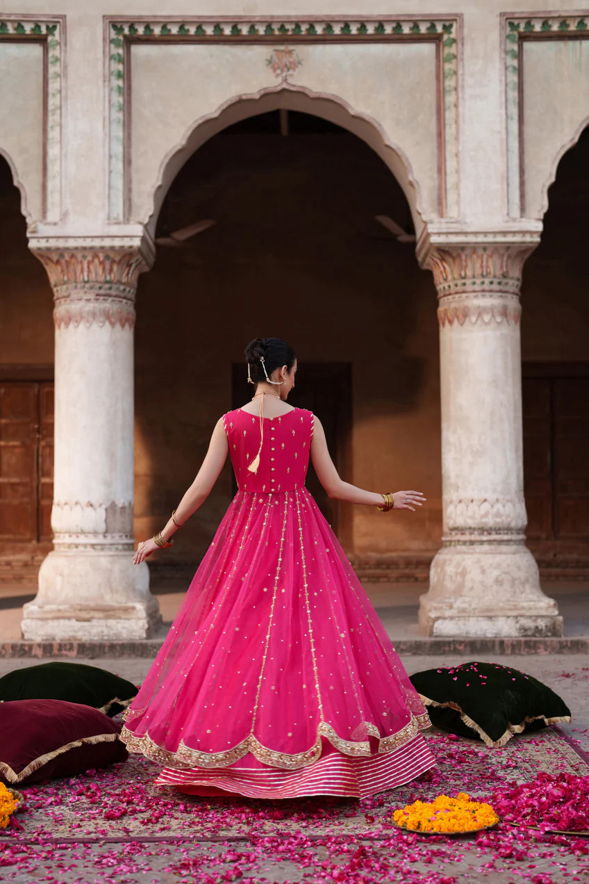 Radiant and regal, this fuchsia pink embroidered lehenga set blends traditional craftsmanship with contemporary sophistication. The sleeveless blouse features intricate gold zari and sequin embroidery, creating a richly ornate bodice that instantly draws the eye. The structured silhouette of the lehenga flows gracefully, adorned with delicate scattered embellishments that shimmer with movement.