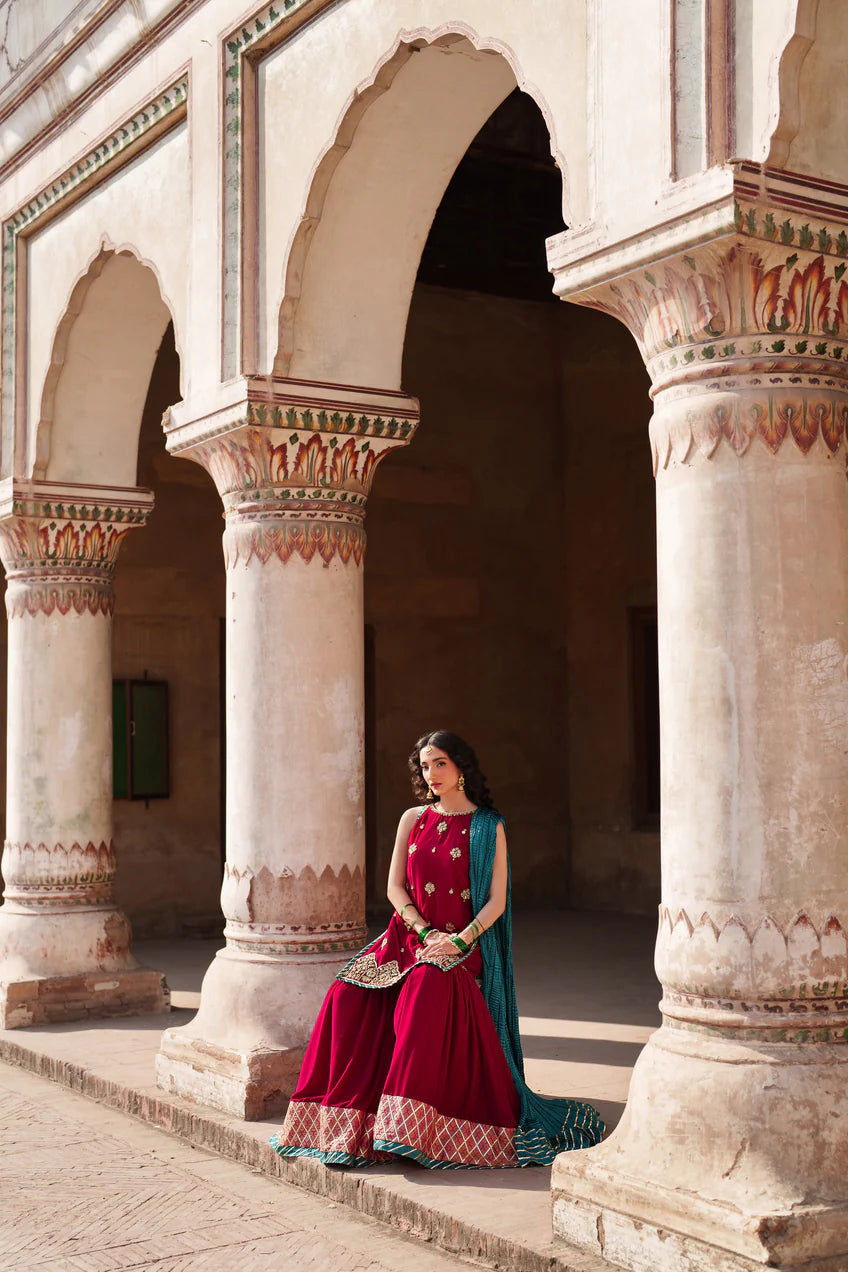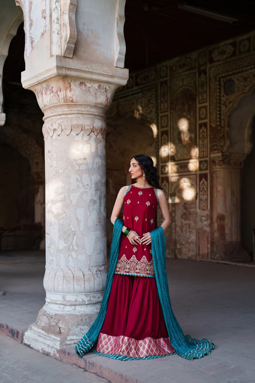 A stunning blend of tradition and bold color, this deep maroon gharara set exudes elegance and festive charm. The sleeveless kurta features delicate gold motifs scattered across the bodice, paired with an intricately embroidered hem showcasing ornate patterns in metallic threads. The rich maroon hue brings depth and sophistication, beautifully contrasted by the vibrant teal dupatta draped effortlessly around the shoulders.