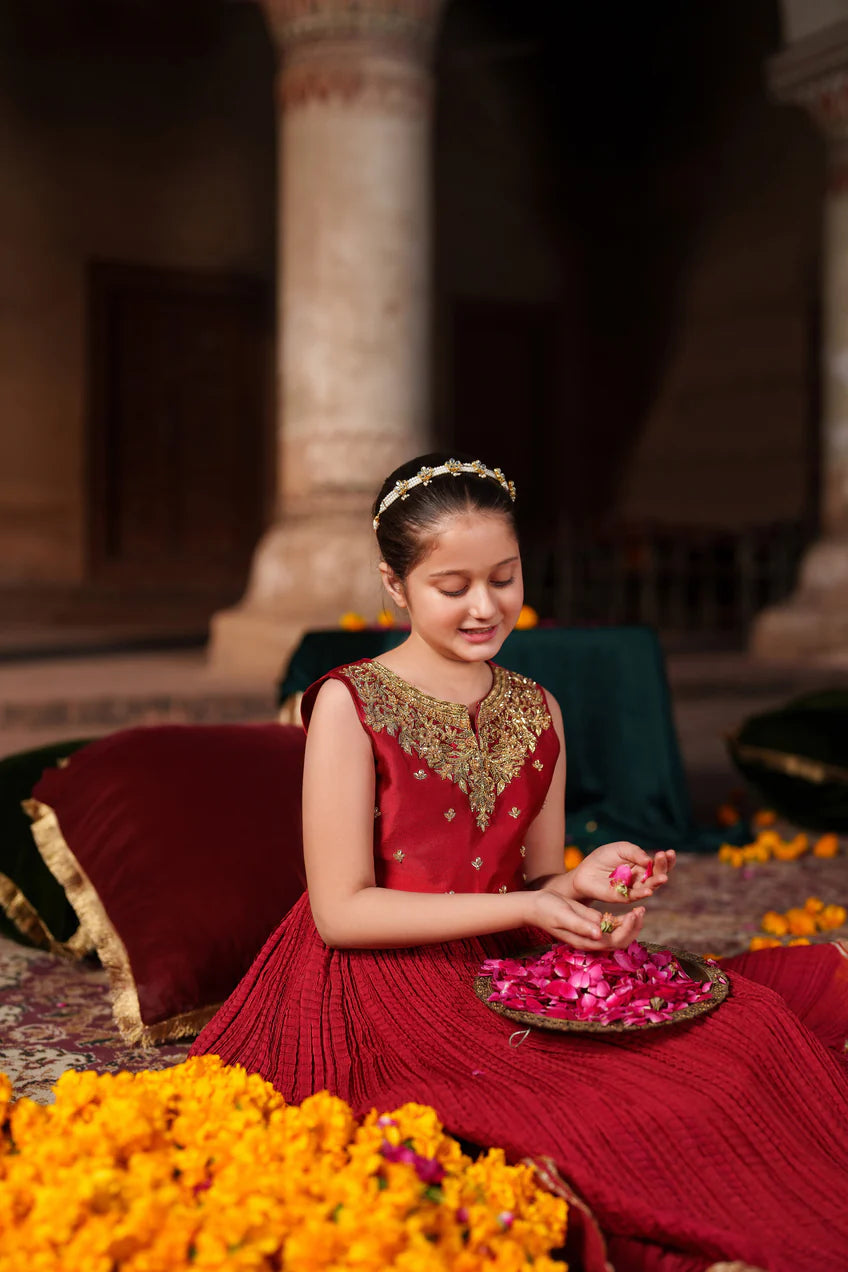 This regal ensemble features a rich deep maroon tissue silk choli, meticulously embellished with traditional adda, dabka, zardozi, and thread handwork. The ornate patterns cover the front and sleeves, creating a luxurious tapestry of craftsmanship that highlights the elegance of the velvet base. The structured neckline and half-sleeves add a refined, classical silhouette.