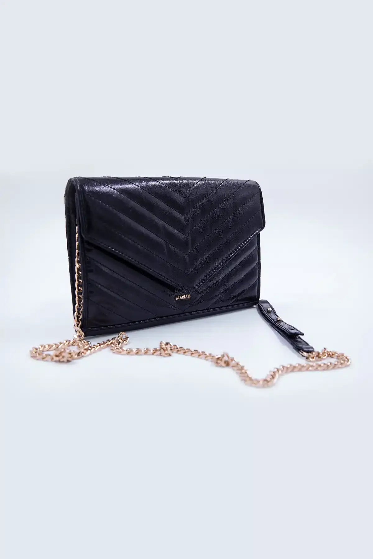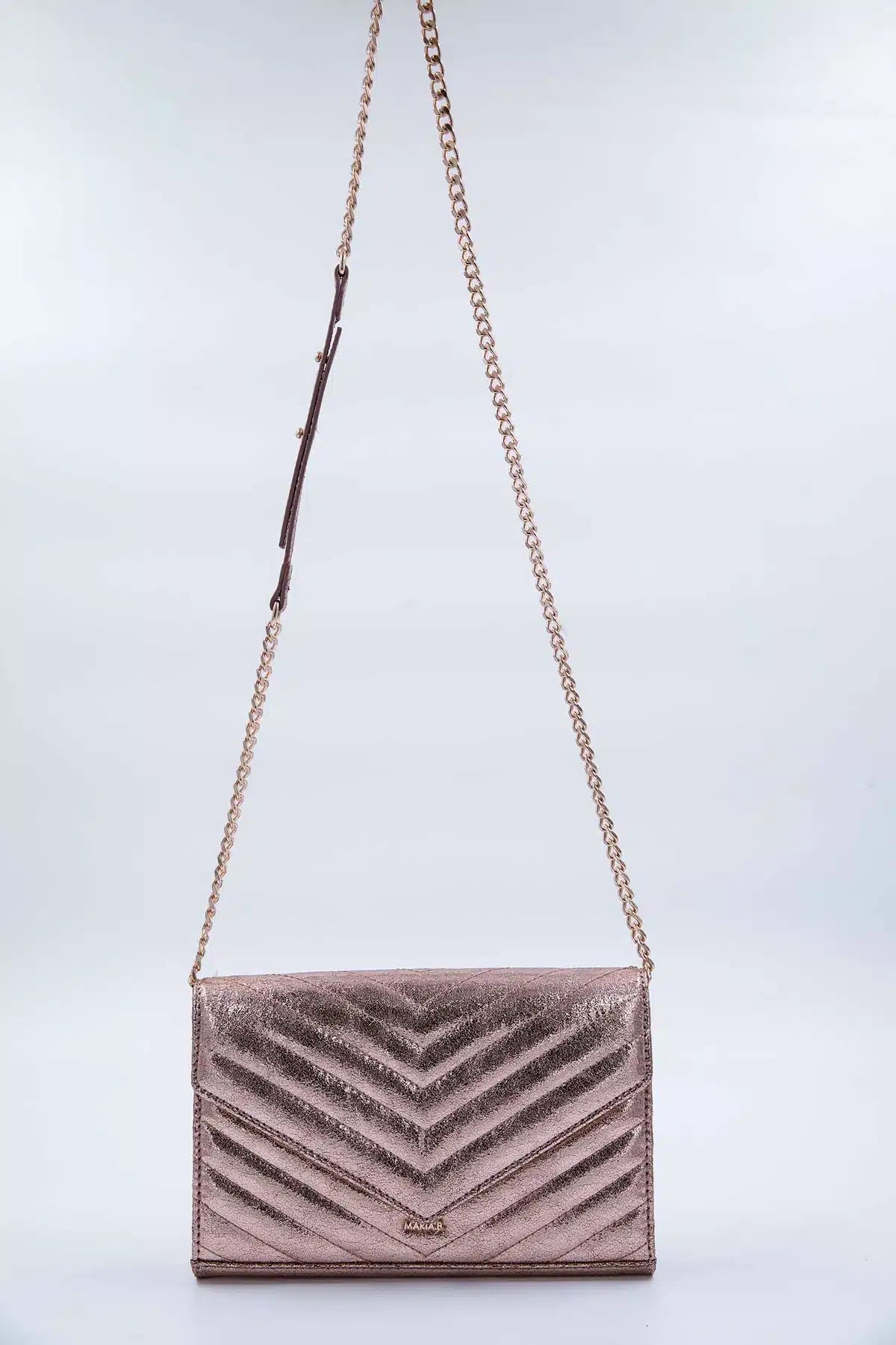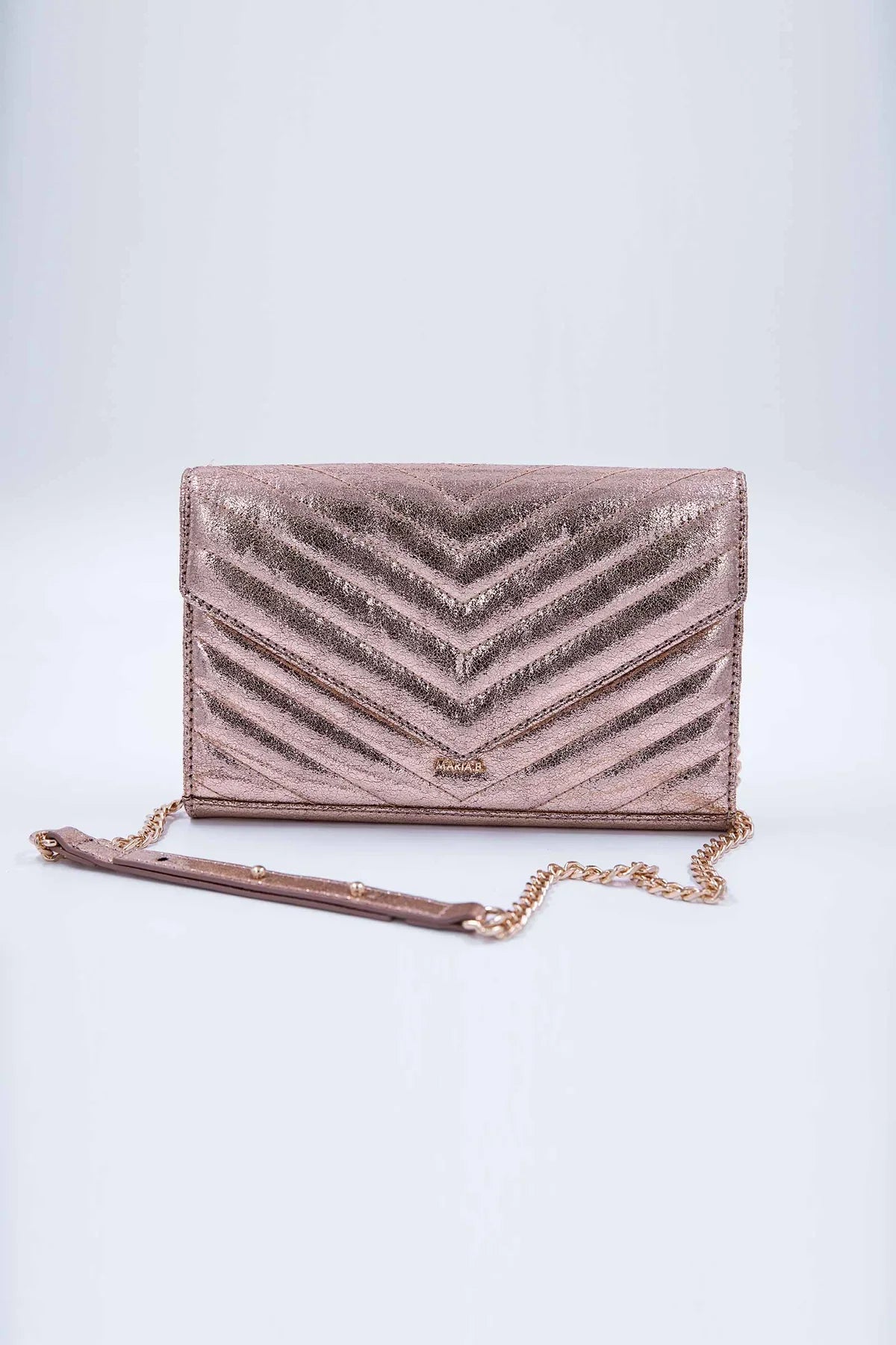 Shining with a glistening matte sheen, this shimmery clutch features a quilted design with a fold-over flap, adding a bit of glam to its look. It fastens with a magnetic-lock clasp, with a metallic chain strap for over-the-shoulder carrying. Wear it with your formal and evening look for an understated style statement.