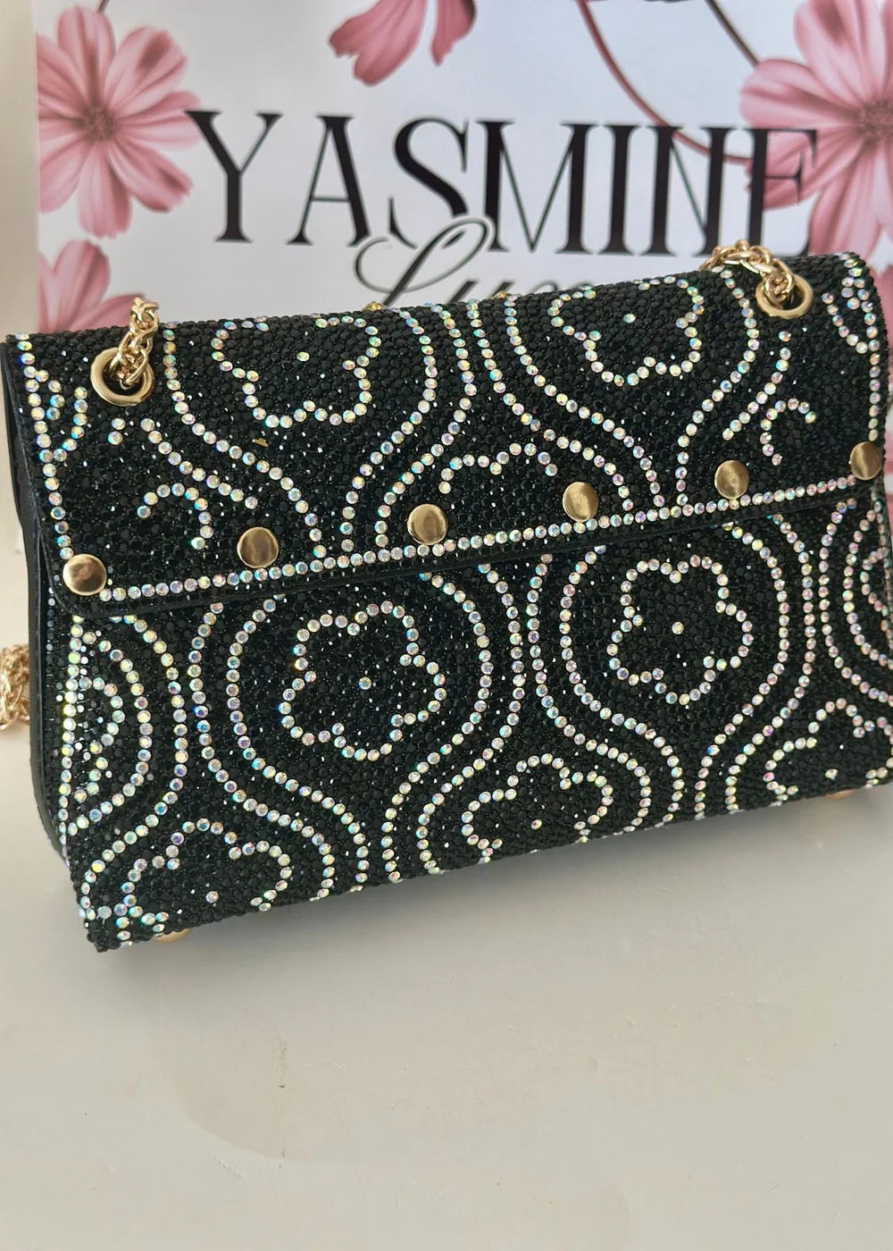 This exquisite black clutch features a stunning and intricate floral and swirl pattern, meticulously embellished with shimmering rhinestones. The gold chain strap and richly decorated surface make this a perfect statement accessory for any evening event. Size: Length: 7.9 inches Height: 4.72 inches