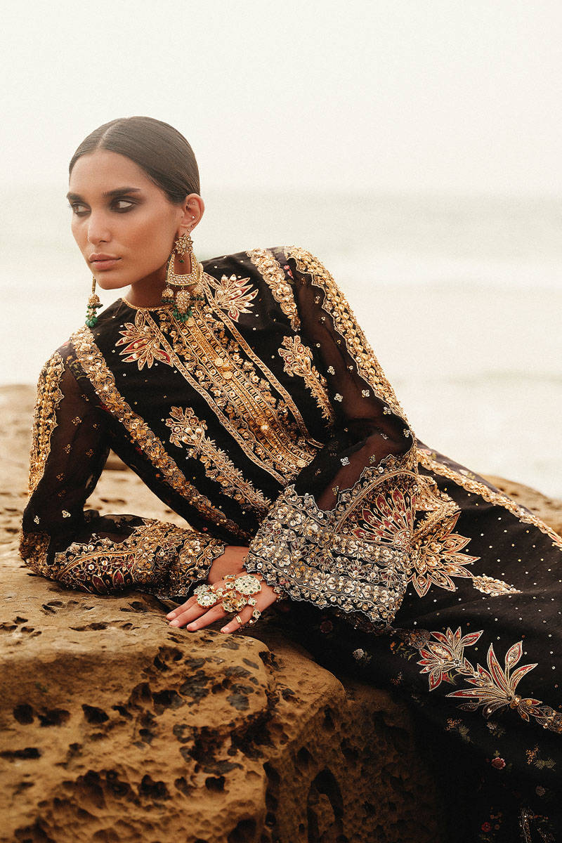 "Shamaim," is a kohl hued bridal ensemble that marries tradition and contemporary grace. The Italian silk digital-printed organza shirt, adorned with exquisite appliques and side panels embroidered to perfection, is a canvas of artistry. Enhanced by intricate block print and adda work, it tells a story of heritage and elegance. The organza dupatta, featuring block and ari work, adds an enchanting touch, while the Italian silk trousers with block-printed motifs and decorative trims complete the ensemble with sophistication and style.
